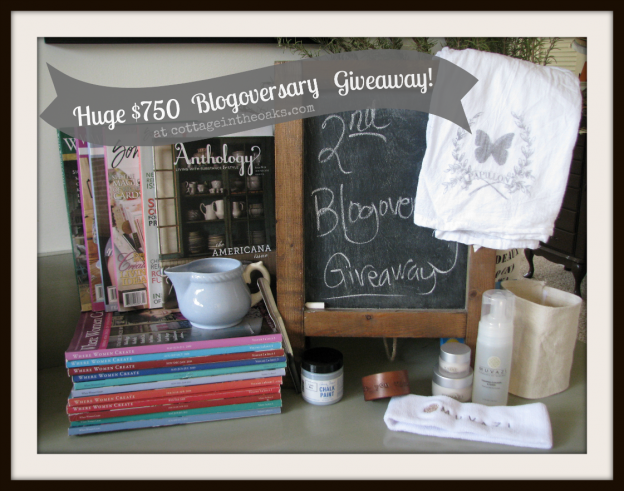 http://cottageintheoaks.com/ is hosting an awesome giveaway. I wanted to share all about it but my computer is freezing up and I am going to have to shut it down. So wanted to get this up and a shout out to them and say Happy Anniversary. Please head over to find out all the details on this amazing giveaway! Over $750.00 value. Enjoy your eveing. Blessings Pam